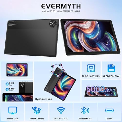 【Wi-Fi 6 & Bluetooth 5.4】Evermyth Android tablet features the latest Wi-Fi 6 and upgraded Bluetooth 5.4. It supports dual-band (5GHz/2.4GHz) Wi-Fi connectivity for stable, high-speed transfers. Bluetooth 5.4 ensures seamless compatibility with all your favorite accessories.