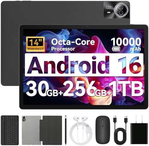 Home Android URAO Tablet|14 inch Android 16 Tablet|30GB RAM 256GB ROM|1920 * 1200 IPS FHD|10000mAh 30W Fast Charging|Octa-core Processor|Wi-Fi 6, BT 5.4|Dual Camera with Keyboard|Mouse|Stylus|Case|Headphone
