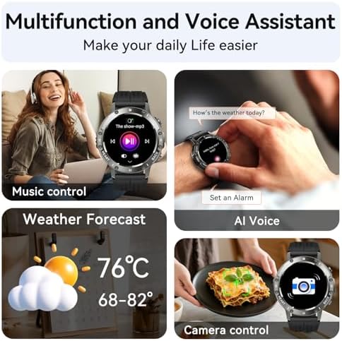 LED Flashlight, Multifunction and Voice Assistant Mens Smart Watch: The reloj smartwatch para hombre delivers practical features like LED flashlight, Activate it with the side button for added convenience. The iphone compatible smartwatch powered by AI voice assistant technology and includes compass, music control, gaming entertainment—smartwatch for iphone bringing smart living to your wrist. The watches smart watch also offers multiple language settings like English, French, Spanish and more.