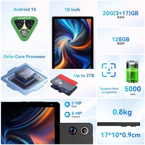 【Android 15&High Performance】Get ready to zip through everything on the latest Android 15 tablet. An advanced 8-core processor and massive 20GB RAM (plus smart tech for extra smoothness) deliver desktop-like speed. Game hard, stream your favorite shows in HD, or run multiple demanding apps at once – no frustrating lag, just smooth sailing.
