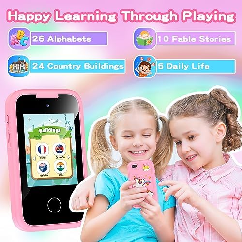 New Upgraded Toddler Phone: The ASIUR kids play phone offers more diverse entertainment and new features. Including 10 fable stories, 24 landmark buildings, 26 ABC learning, 5 daily life, and painting. Kids phone supports selfies, video recording, and a 3.5mm audio jack. Improve the experience for your kids growth with interesting. Provide entertainment while keeping kids away from the phone with the internet.